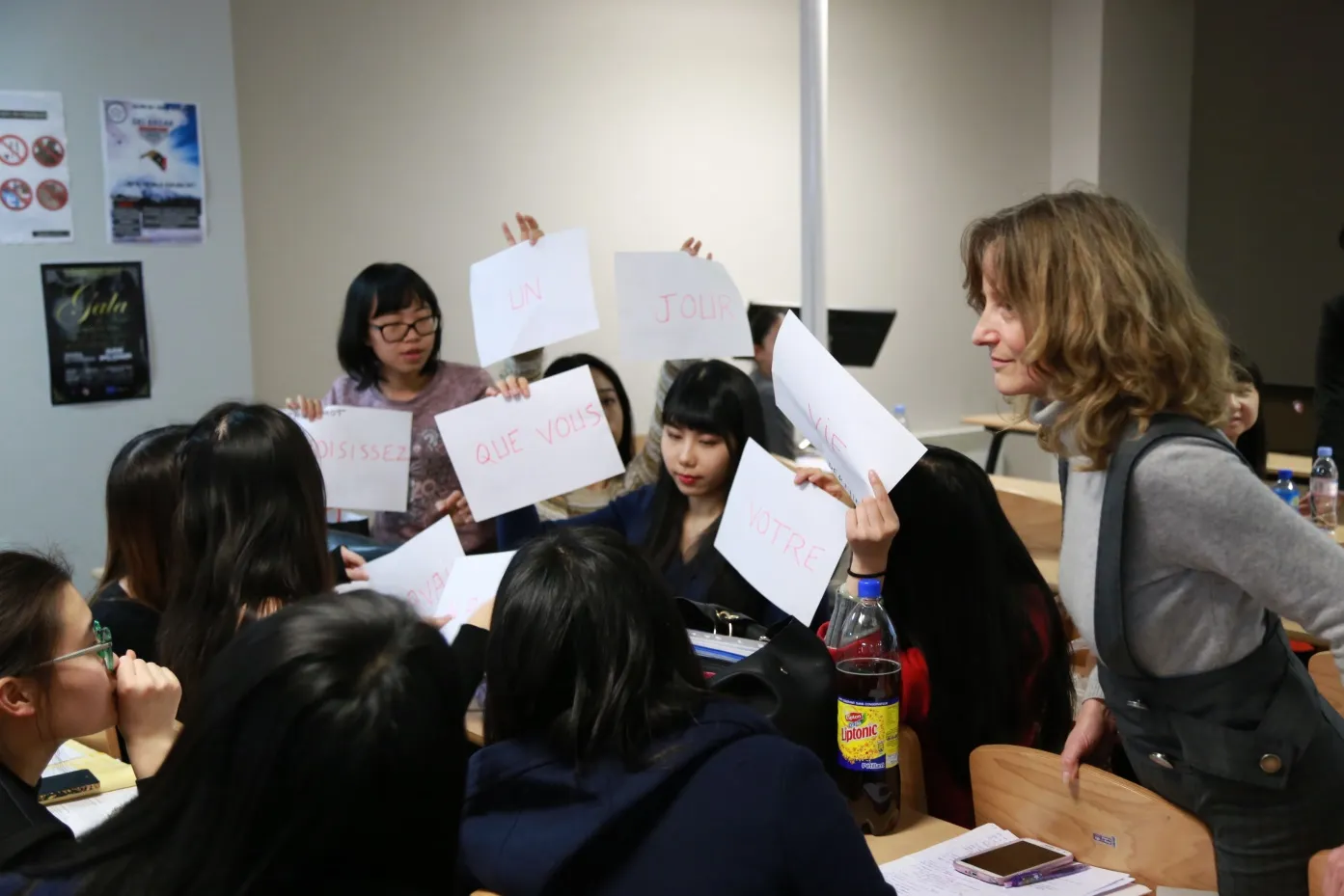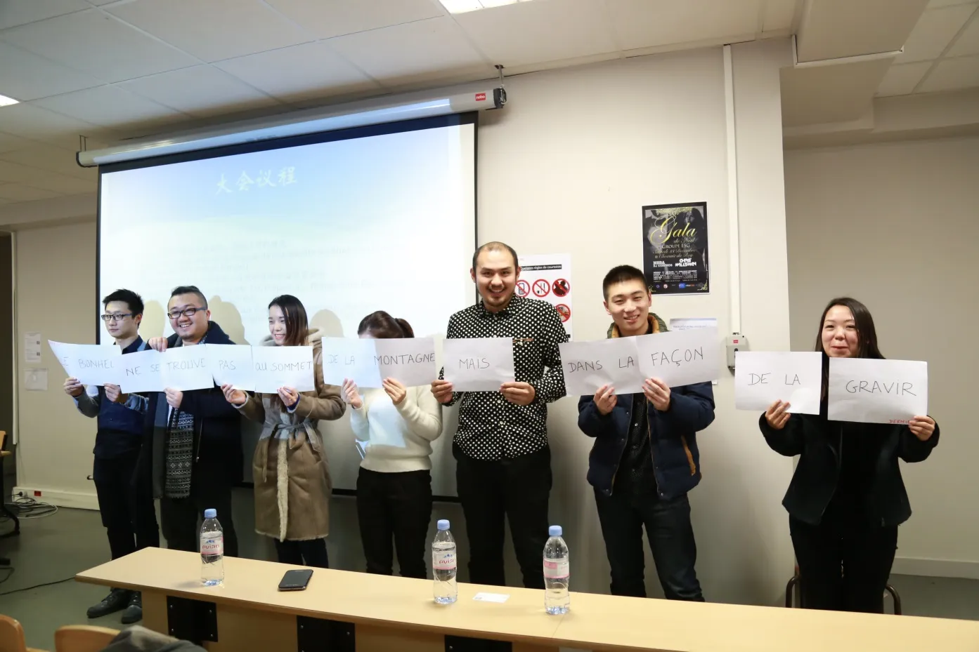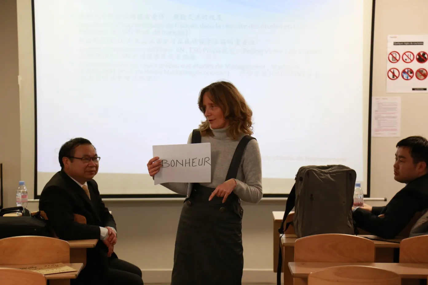 1999年预科创办时第一批就被聘为专业预科市场营销的Toussaint老师,更是将会场变成了生动的课堂。她把同学们分成两个小组,让大家发挥想象力,要求将她给出的单词组合成两个句子,而这两个句子是孔老夫子的语录, « Le bonheur ne se trouve pas au sommet de la montagne, mais dans la façon de la gravir », « Choisissez un travail que vous aimez, et vous n’aurez pas à travailler un seul jour de votre vie » - Confucius. Toussaint老师想送孔子的这两句语录给法语预科同学们以表达她的殷切期望。