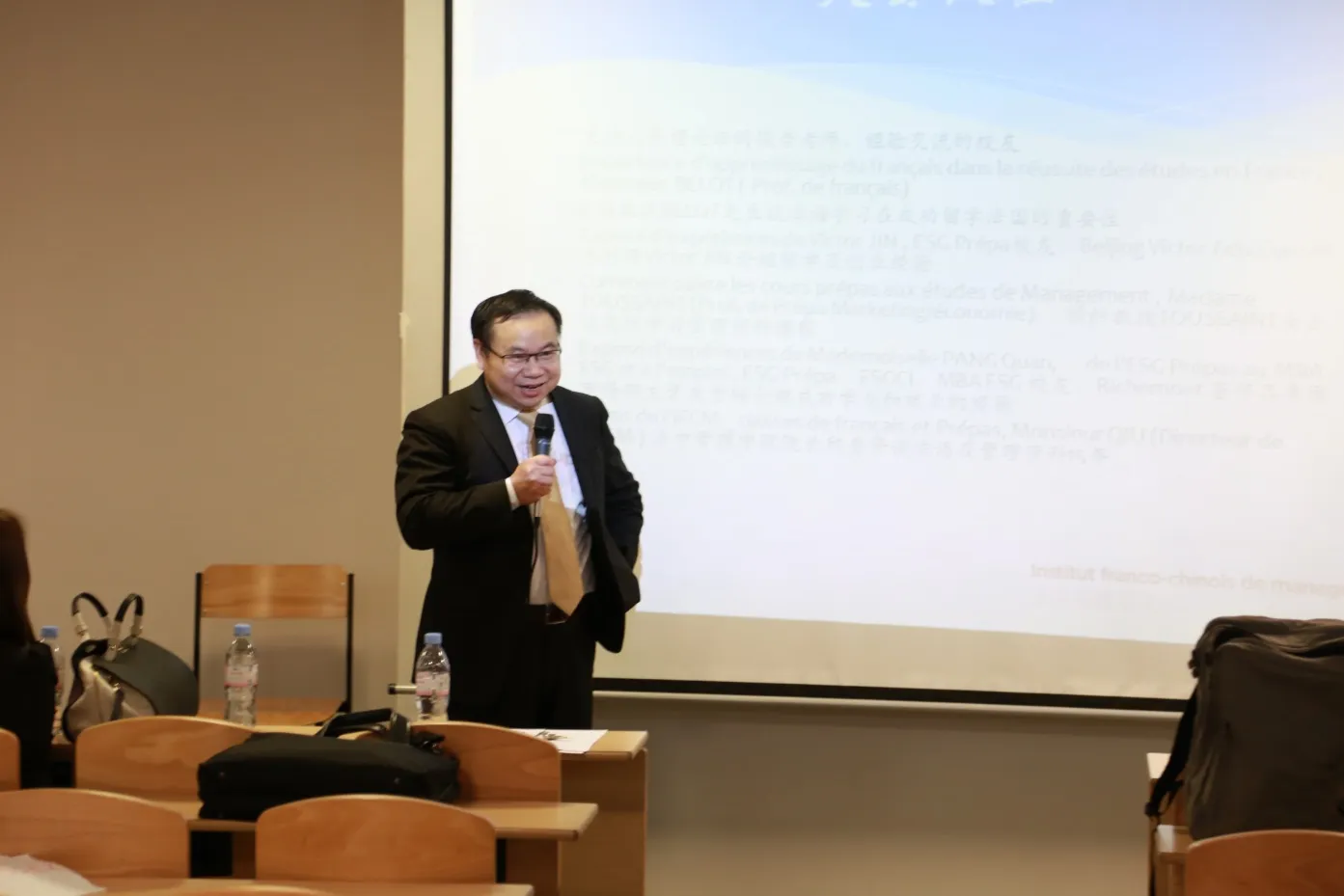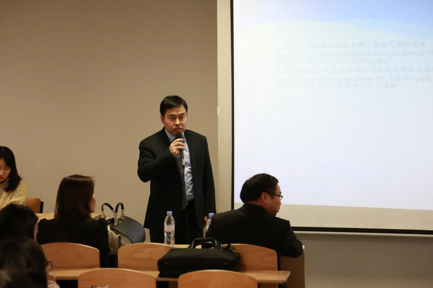 Groupe ESG法中管理学院法语预科中心主任邱博士在论坛的发言中回顾了法中管理学院的十五年历程。十五年风雨兼程,十五年悲喜交融。邱博士解读了法语预科中心创立的背景,解释了法语预科的办学宗旨;分析了预科陷入低谷的原因,分享了走出困境取得长足发展的喜悦。十五年来他一直坚信:较好的法语水平和一定的专业法语基础是成功留学法国的两个必备条件。作为预科创始人的邱博士,十五年来他倾吐心血,把预科办成了特色,由此他感到无比自豪。他感谢所有支持帮助过预科的老师、社会各界合作伙伴。 他期盼将来会有更多的同学加入到预科行列中来,他决心把预科建设成一流的预科学院。他希望同学们能更多地去了解法国的艺术和文化,开拓眼界,联谊更多的校友,与他们相聚,与他们交流,不断学习,不断进步。他鼓励大家要敢于梦想,也要敢于去实现梦想,要善于梦想,更要善于去实现梦想。这就是庆祝法中管理学院法语预科十五周年所提出的“相聚、进取、圆梦”的真谛。