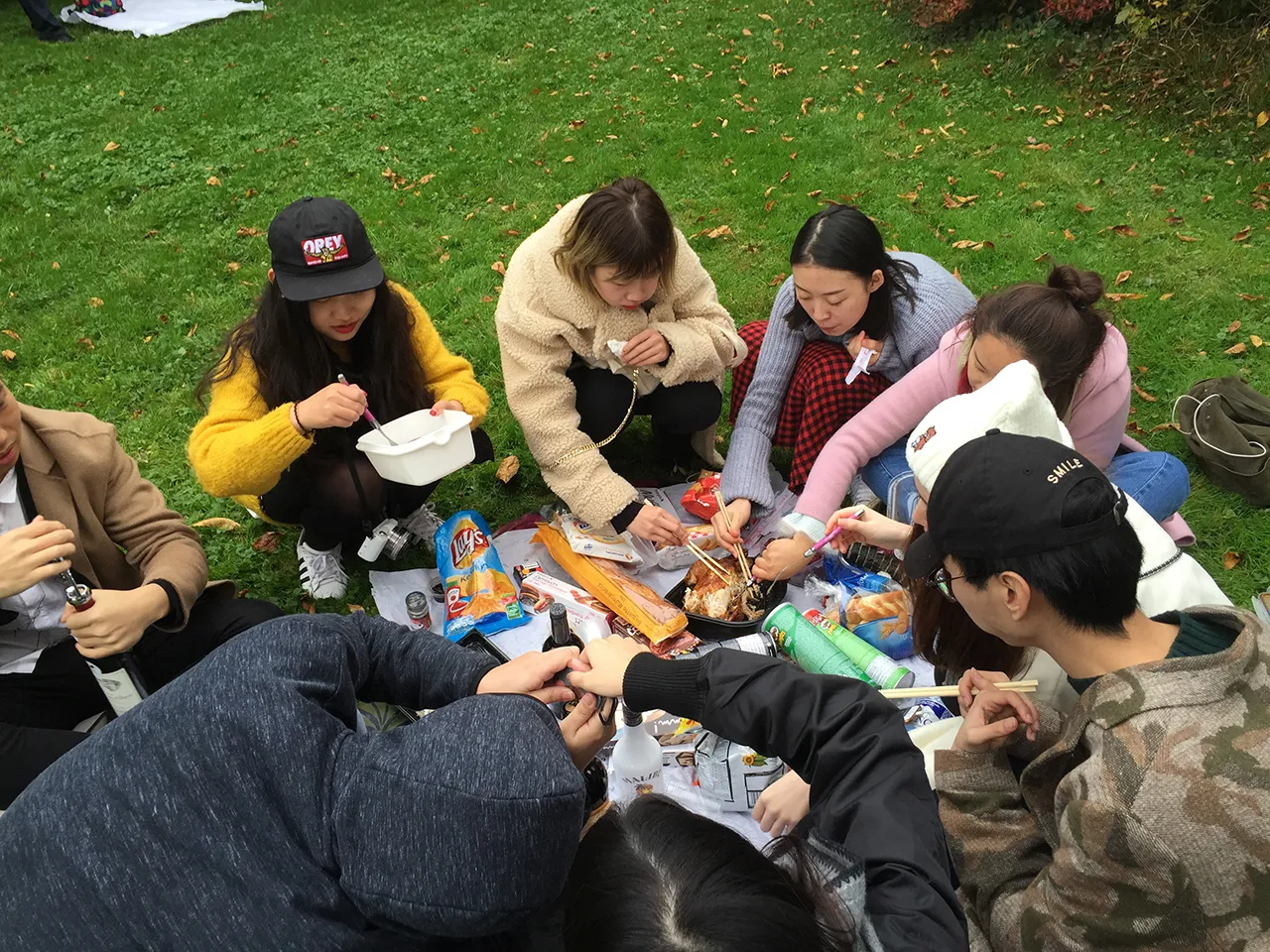 震撼的参观游览以后,大家来到老师们提前选好的湖边,拿出提前准备好的食物开始彼此分享,小编偷偷一瞄,邱老师贴心地为大家亲手制作了点心还有邱夫人朋友上周从国内家乡带来的童年的回忆—-“猫耳朵”,吉老师也准备了一些水果和巧克力蛋糕给同学们分享,有的同学凉拌了黄瓜还有豆腐皮,还有的同学拿出了珍藏的国内带来的牛板筋,场面着实很热闹,感觉像过年一样的。愉快地午餐结束后,大家自觉地拿出一早准备好的垃圾袋,把草坪收拾干净才依依不舍地离开。