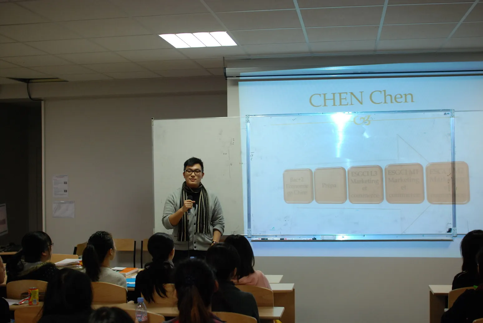 首先是2009年秋季预科班的校友陈辰,他是修完1个学期预科之后进入L3,然后M1 现正在ESGCI的M2就读市场营销与商贸专业。他认为预科阶段所学的专业课特别是marketing和économie对他之后的专业学习非常有帮助,建议并且鼓励大家认真扎实的学好这两门专业基础课。针对ESGCI的面试,他提到面试会有一些英语问题,但并不会很难,只需简单回答即可。至于ESGCI毕业时需要Toeic达到700分以上(满分990),他的建议是从进专业开始就别放松英语学习,加上学校每周都有Toeic的辅导课程,过700分对学了10几年英文的中国同学而言不会太难,大家应该有信心。