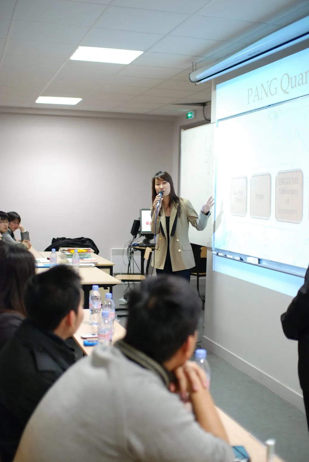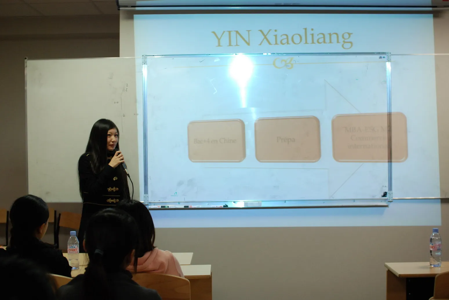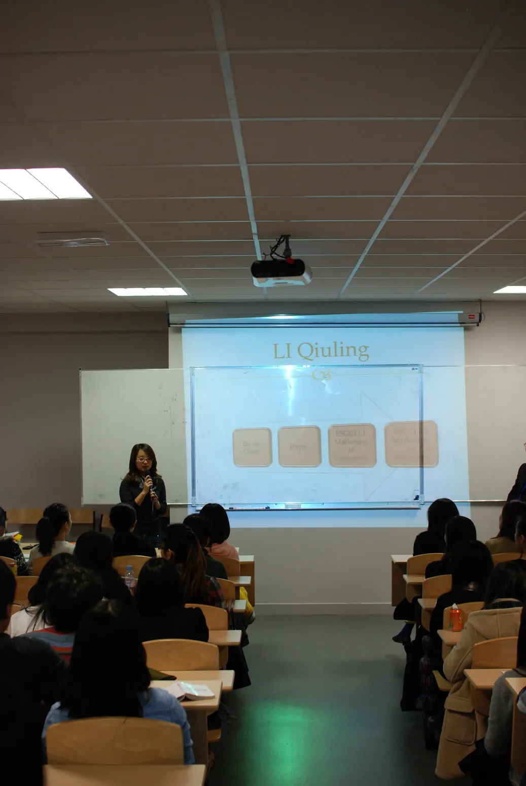 第二位上台介绍的是孙珏同学,她是去年秋季预科班的同学,也是1个学期预科进入春季ESGCI的L3,完成L3 学习后,她选择了今年秋季MBA-ESG学院的M1。她对这两个学院做了比较,她认为MBA-ESG无论从入学前的专业面试,入学后的小组作业,期中期末考试都比ESGCI的难许多,所以建议同学们选择学院时,要结合自身的实际情况和个人能力。