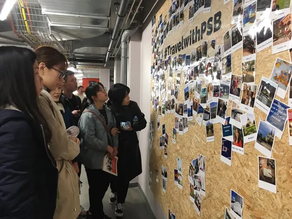 在参观过程中,还偶遇了在该校金融专业授课的中国籍教授,Loïc MATTI先生热情地向同学们介绍并邀请他用中文给大家打招呼。他很亲切地欢迎并邀请同学们来PSB学习,并称这会是一次很好的学习体验。在穿过挂有一幅幅该校名人校友照片的走廊时,同学们发出一阵感叹,并在一面贴满来自世界各地的校友在不同地方拍照的照片墙面前驻足,大家感兴趣地辨别着各个地方,也有同学笑着说,希望有朝一日自己的照片也可以贴上这面墙。之后大家在这面墙前合影留念。