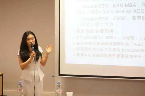 此次活动由欧洲时报新媒体部门负责人柴梦莹女士担当主持。讲座第一环节是由4位在法优秀毕业生讲述自己职场生涯的种种经历。首先出场的是获得ESGF与MBA-ESG双学位的赵英女士。赵英女士目前在巴黎创办了一家咨询公司,她通过自己一路走来的切身经历为在场的准毕业生们提了三条职场建议:1.坚持不懈 2.不断学习 3.尊重他人。