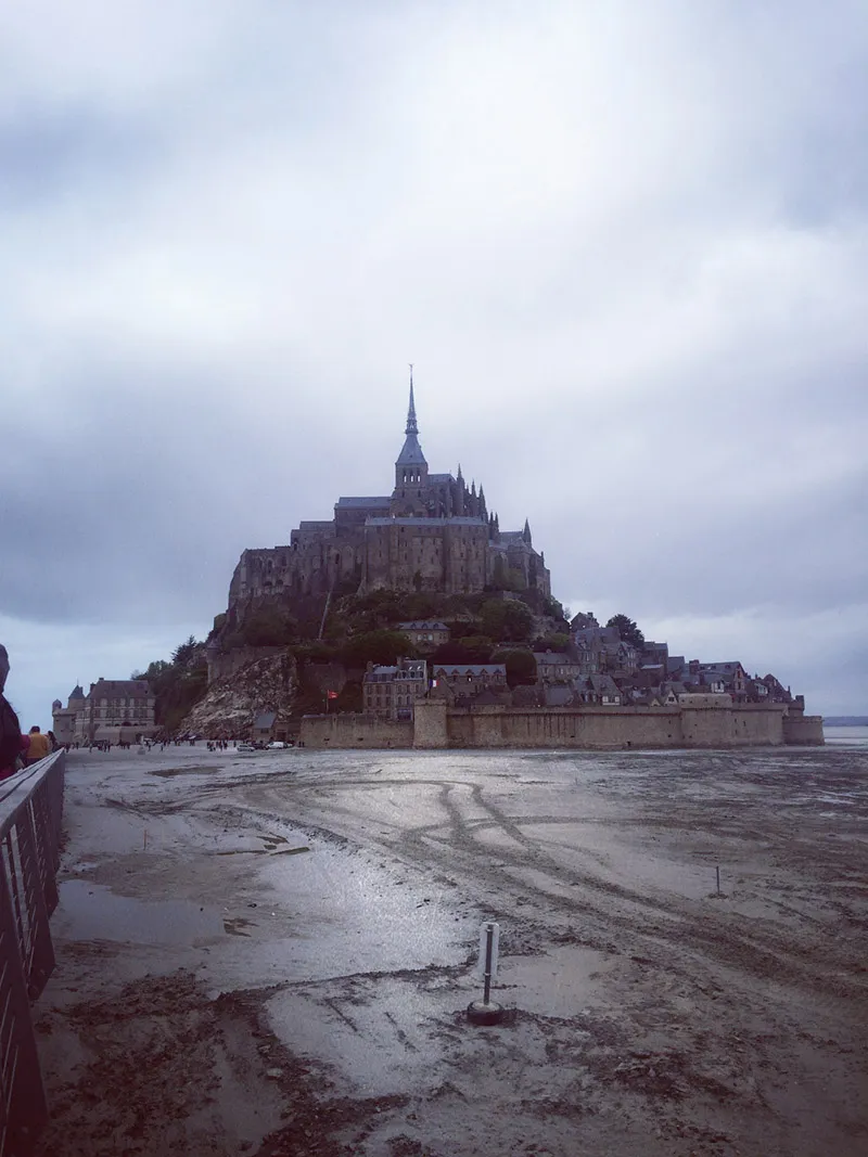 12点30分我们离开圣马洛向圣米歇尔山进发。圣米歇尔山位于诺曼底和布列塔尼的交界处,是一座潮汐岛,它在落潮时被泥沙包围并与大陆连在一起,傍晚涨潮时成为岛屿,场景蔚为大观。岛上顶部修有修道院(Église Abbatiale du Mont St-Michel),是天主教徒的朝圣地。修道院教堂建于山顶的岩石尖上,教堂的十字翼基于坚固的岩石之上,唱诗台和翼部由下面的房间支撑。教堂混合了多种建筑风格,将11-12世纪诺曼底罗马式的中心、南翼与15世纪末哥特式火焰状的唱诗台结合在一起。修道院的顶部拥有天使米迦勒(法语音译即“米歇尔”)屠龙的镀金铜像,象征着正义战胜了邪恶。来到山上,尽是琳琅满目的特色手工纪念品和美味可口的可颂饼,各国游客也络绎不绝……