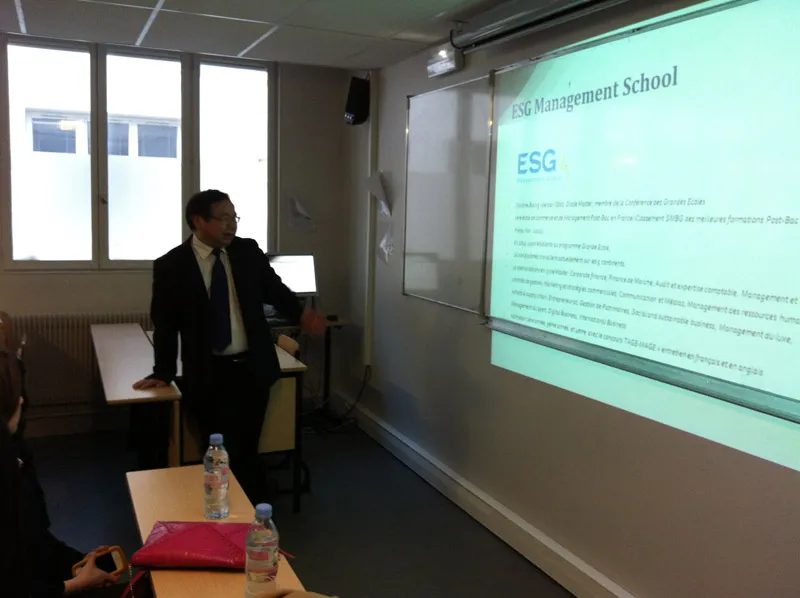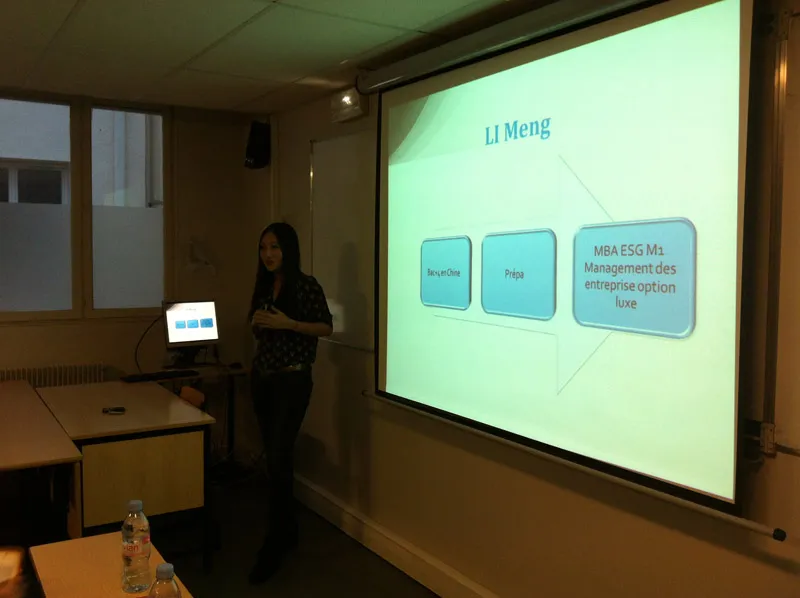 Tout d'abord, Mlle ZHAO Zhengling, étudiante en M1 a MBA ESG, a présenté son parcours : après avoir obtenu un Master en France et travaille en Chine, elle est revenue en France pour un second MBA. Elle a explique que même avec un Master d'une université publique française, elle estimait ne pas avoir acquis des connaissances suffisamment solides. Souhaitant renforcer ses bases, elle a choisi de revenir en France au printemps 2012 en commencant par la classe préparatoire de français. Après seulement une semaine de cours spécialisés, elle a déjà compris que les cours de langue et les bases professionnelles de la classe préparatoire sont très pratiques et constituent une préparation indispensable pour intégrer les études spécialisées - seule une bonne maîtrise de ces cours permet une transition reussie.