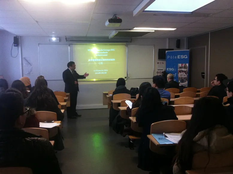 下午2点50分,开学典礼正式开始。Groupe ESG 法中管理学院法语预科中心主任邱博士用法语致词。首先他对前来参加法语预科班学习的同学们表示热烈欢迎。接着,他向与会同学们介绍了Groupe ESG 各学院的专业设置,各学院文凭的种类及其在中国的认证情况,介绍了法语预科课程开设的历史背景,强调了修好预科课程的重要性。