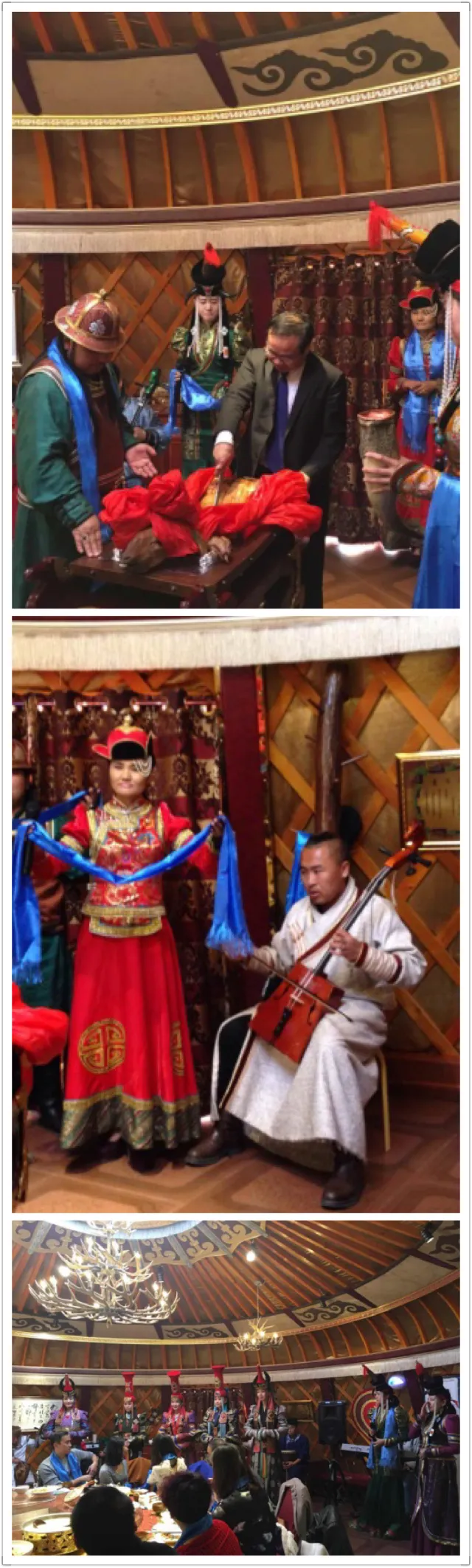 随后,伴随着丰盛佳肴的呈现,彪悍的蒙古大汉和衣着华贵的蒙古族少女献上了歌舞和服装表演; 按照蒙古族的习俗,邱老师作为最尊贵的客人以切全羊的形式宣布了宴会的开始。
