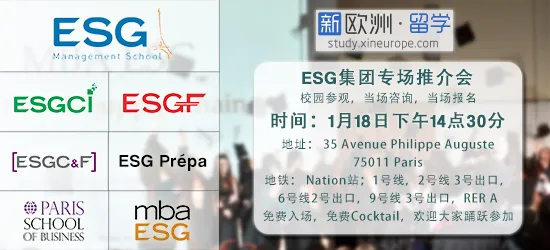 新欧洲留学本期特约 【ESG教育集团】 共同打造此次专业咨询会,旨在通过此次活动向有意进入法国高商系统深造的中国同学更加详细的展示ESG教育集团及其专业,从而使大家更加明确的选择合适自己的专业与学校。 二. 活动内容 1. 总体向大家介绍学校的专业信息 2. 自由提问讨论 3. 参观学校校区 三. 活动时间 2014年1月18日 14h30 四. 活动地点 35 Avenue Philippe Auguste 75011 Paris Métro : Nation站;1号线,2号线 3号出口,6号线2号出口,9号线 3号出口,RER A